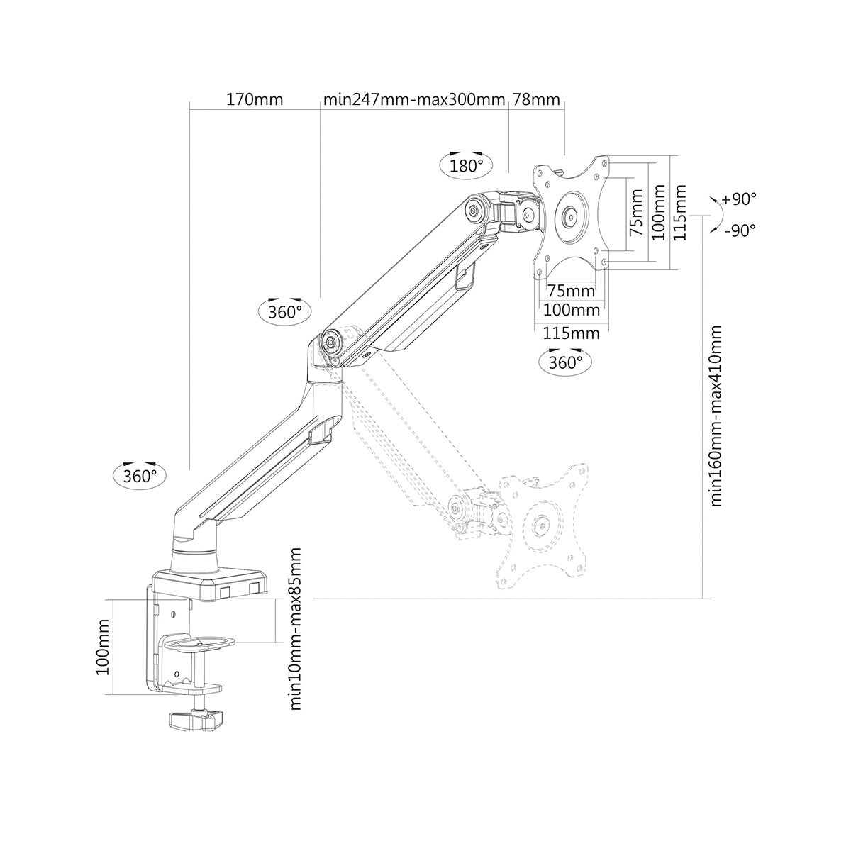 - Installation: Includes C-clamp, grommet mount, hardware, and VESA plate